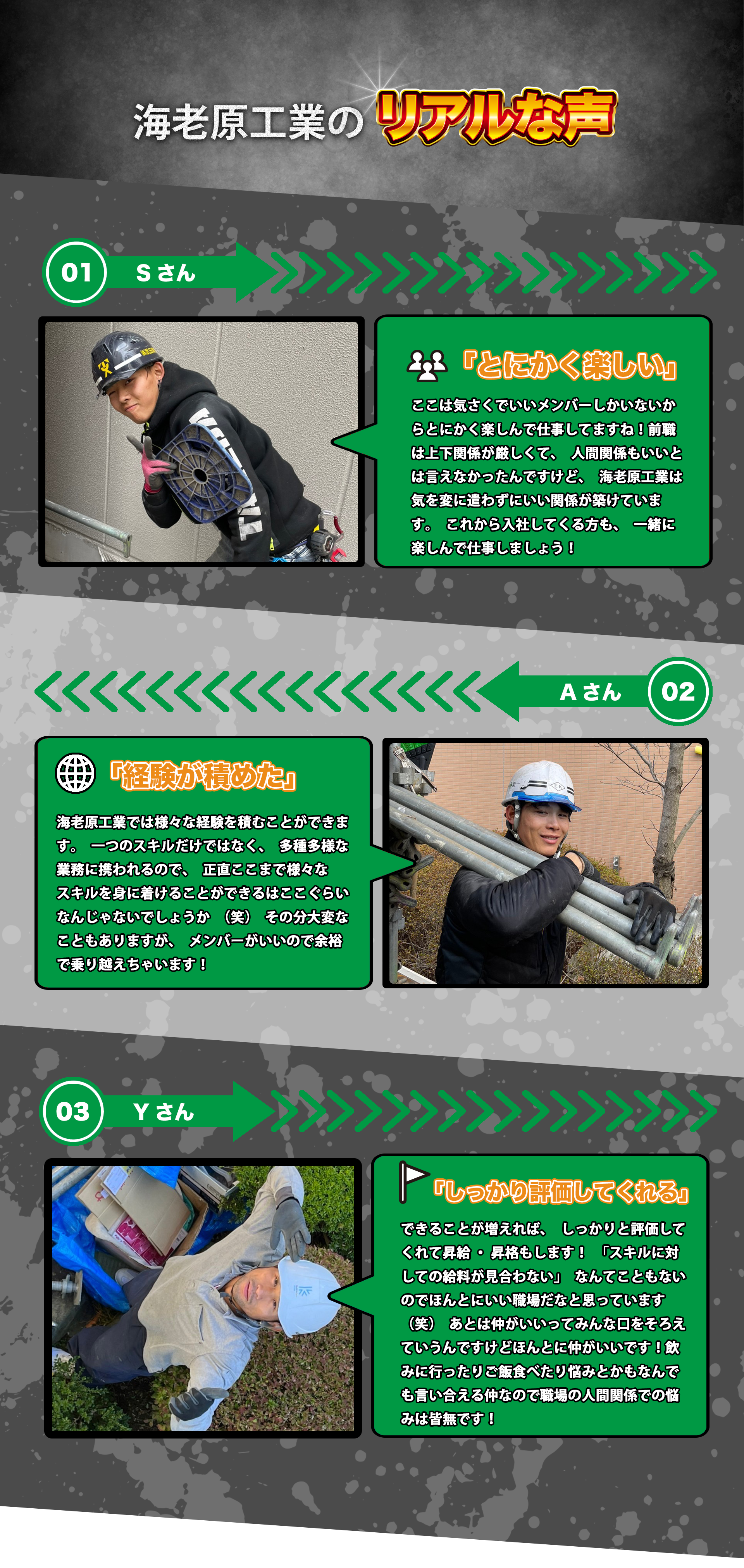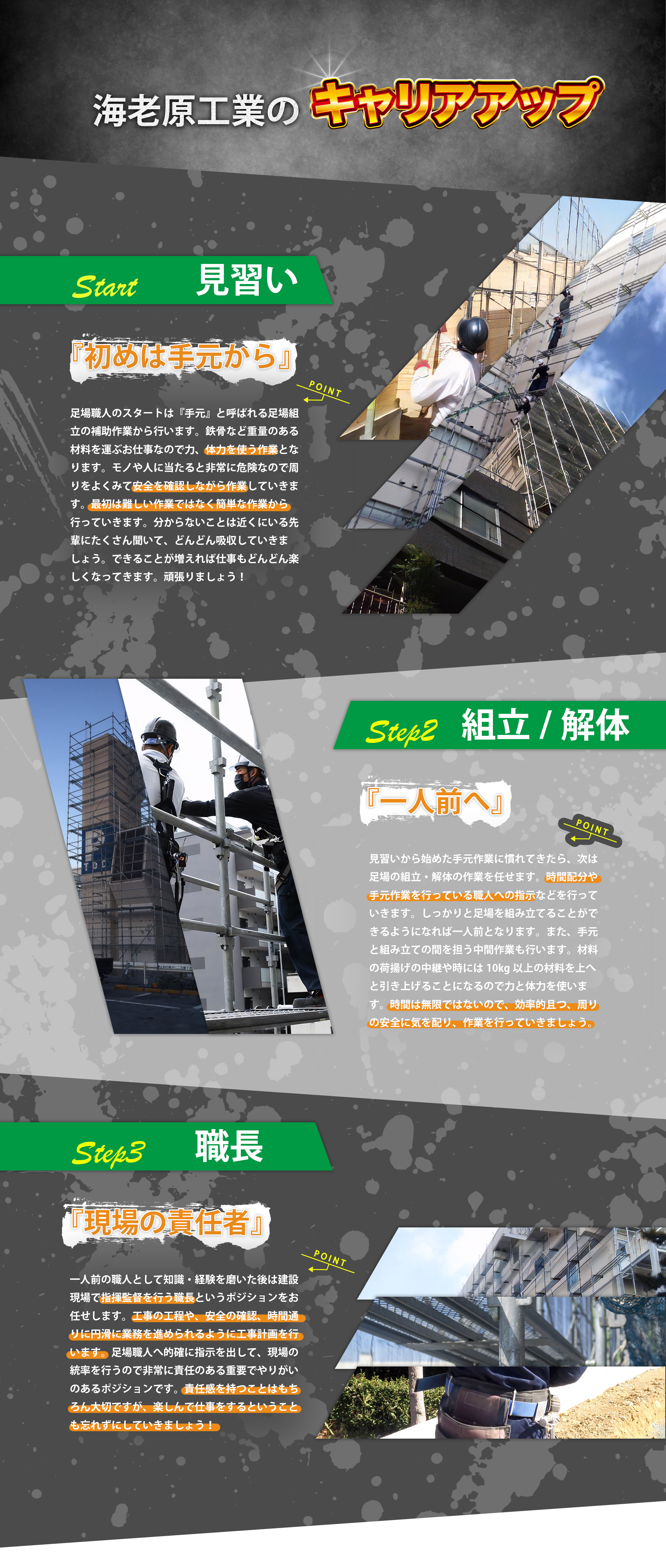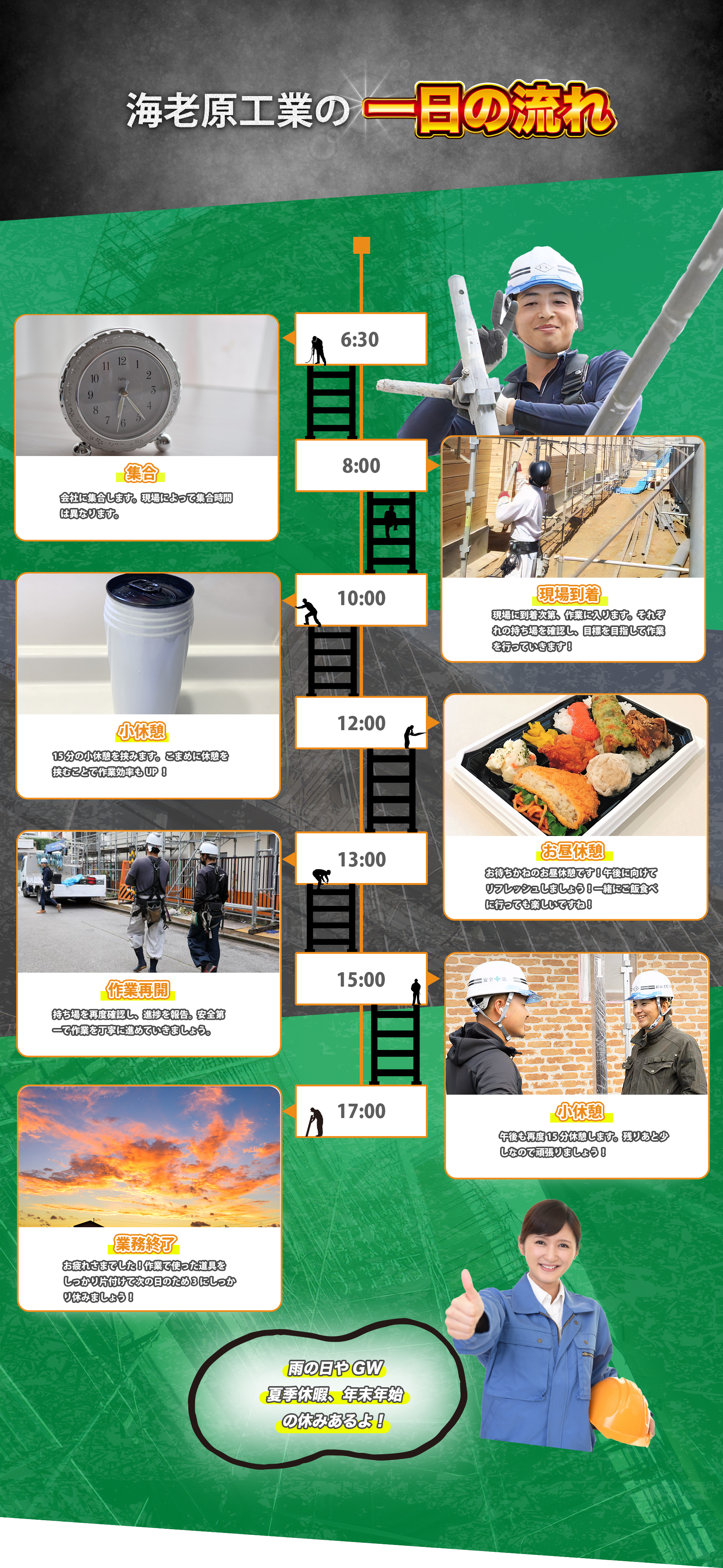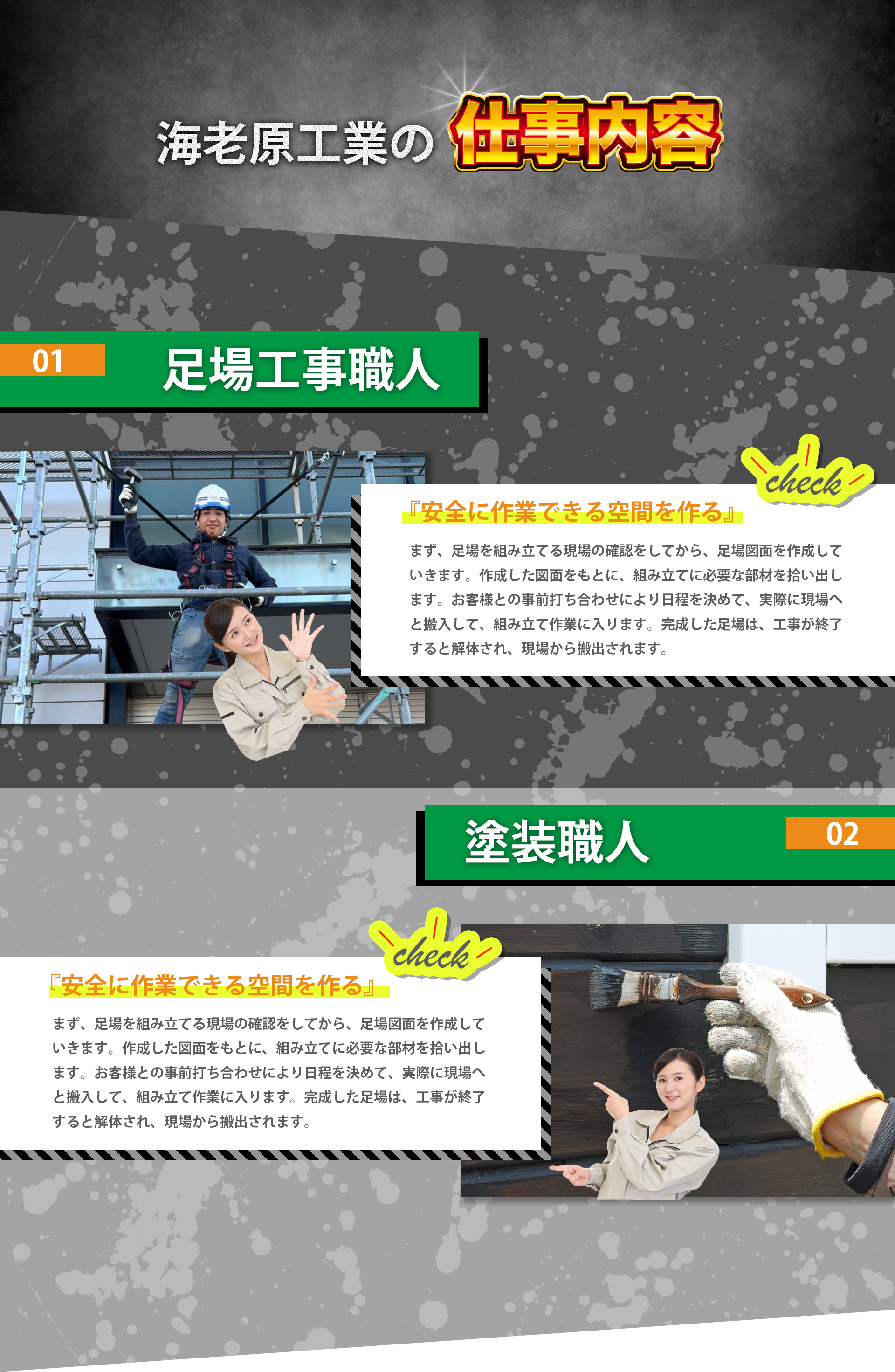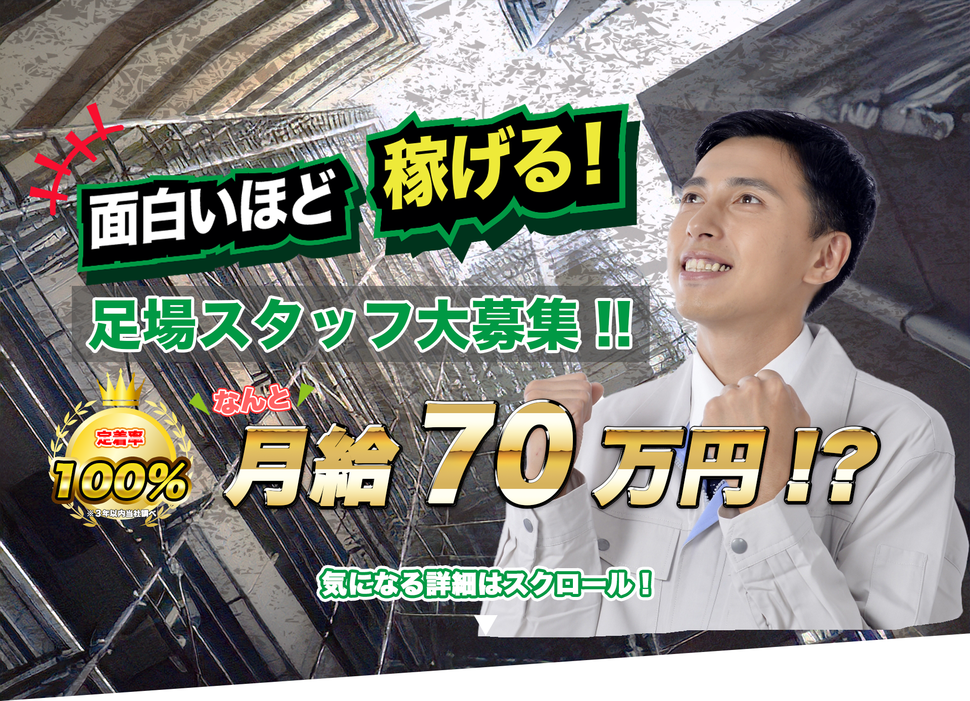 | 仕事内容 | 塗装工事・防水工事・足場組立・解体などの作業を 行っていただきます。 |